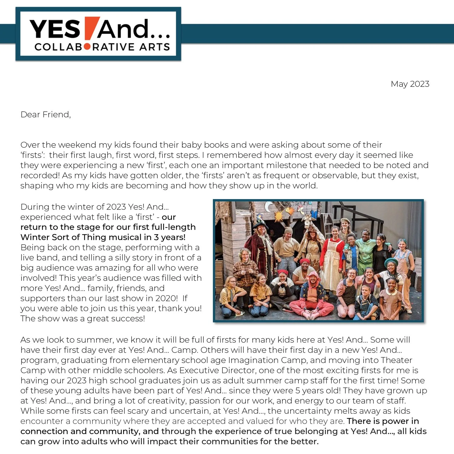 Summers at Yes! And… are full of many firsts as we welcome the largest numbers of children and youth into our programs during 10 weeks of camp. As a faithful Yes! And… supporter, you know that we work hard to make our summer camps open and accessible for all, reducing financial barriers to participation as much as possible. This summer we expect over 75 of our students will request a scholarship.
